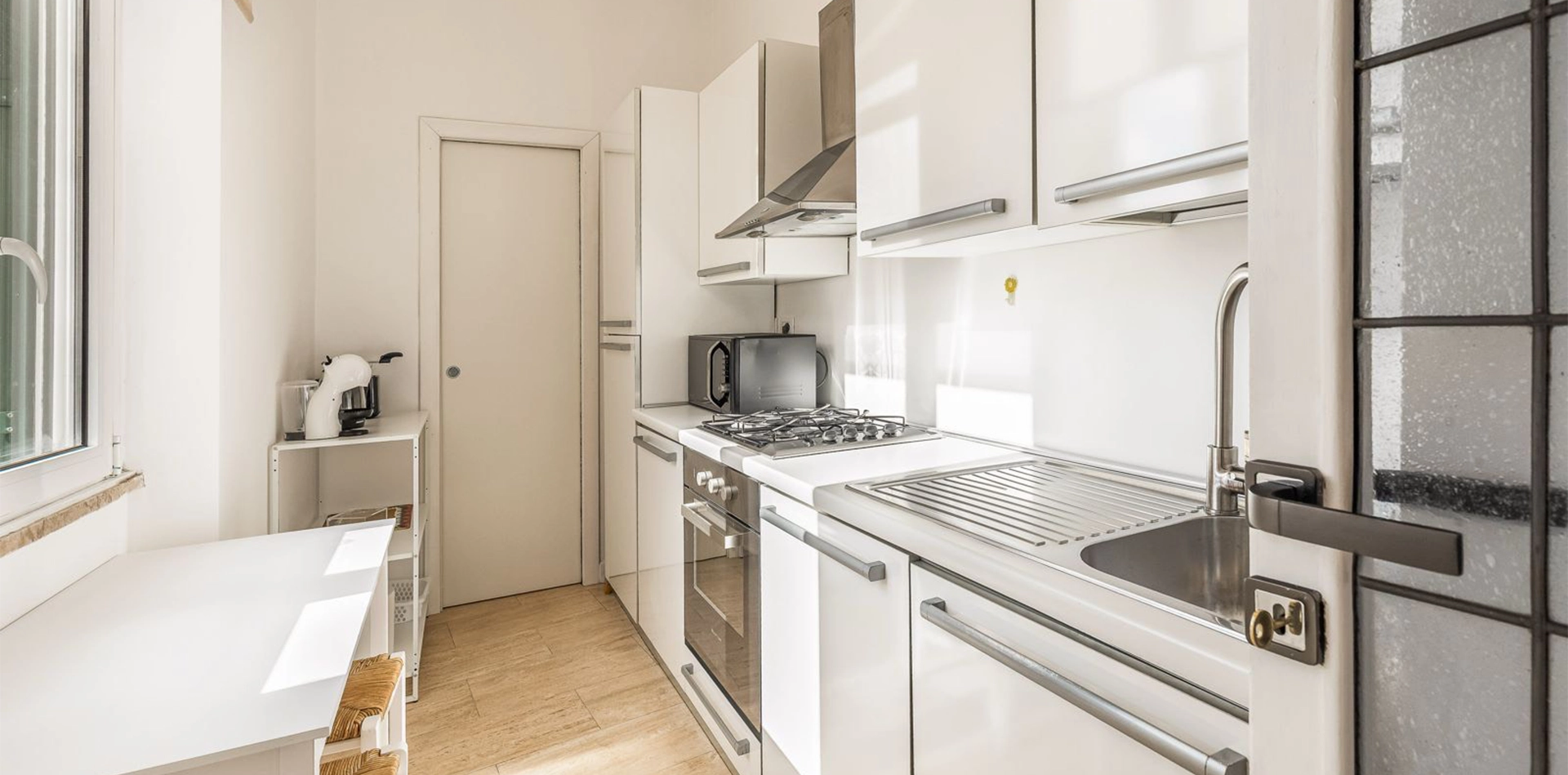 La cucina moderna è completamente attrezzata con elettrodomestici di ultima generazione, tra cui macchina del caffè, bollitore e tostapane, ed è dotata di una comoda lavanderia per un soggiorno pratico e confortevole.